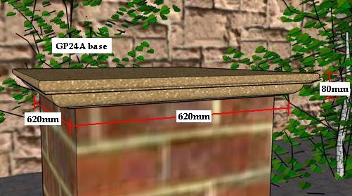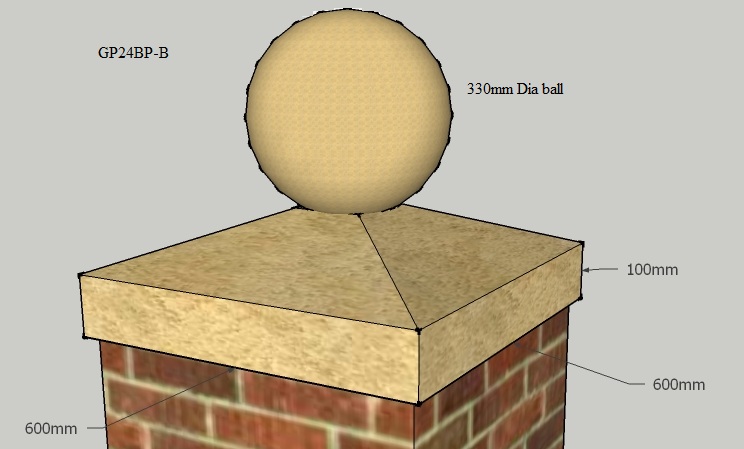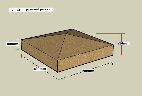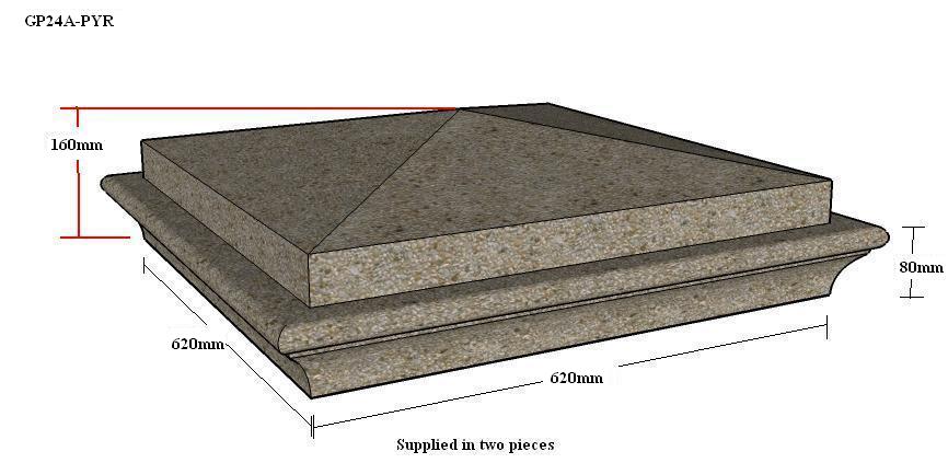 Gp 24A-pyr 620 x 620mm and is suitable for piers up to 610 x 610mm as the extended moulding to the side detail acts as the weather drip.