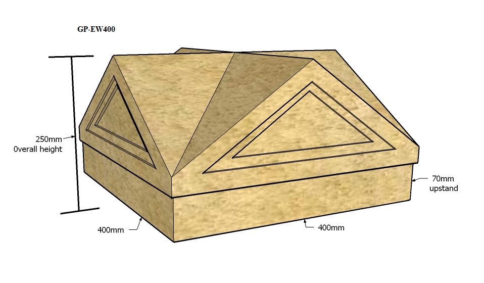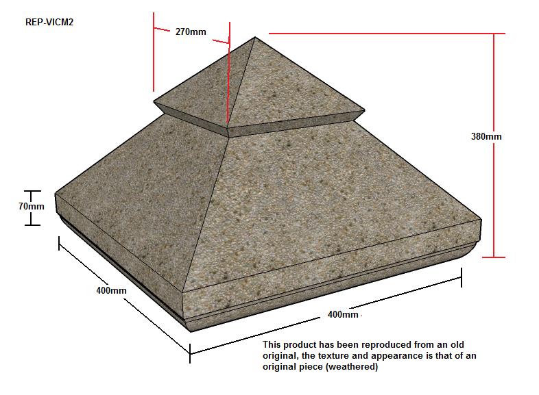 Gp 16A-pyr 400 x 400mm and is suitable for piers up to 390 x 390mm as the extended moulding to the side detail acts as the weather drip.