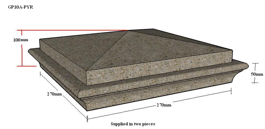 Gp 10A-pyr 270 x 270mm and is suitable for piers up to 260 x 260mm as the extended moulding to the side detail acts as the weather drip.