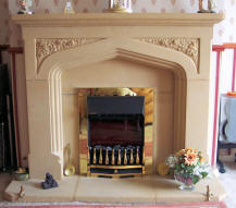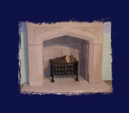 A Fine example of a Tudor arched fire surround with back panels,  shown here in a composite Bathstone finish.